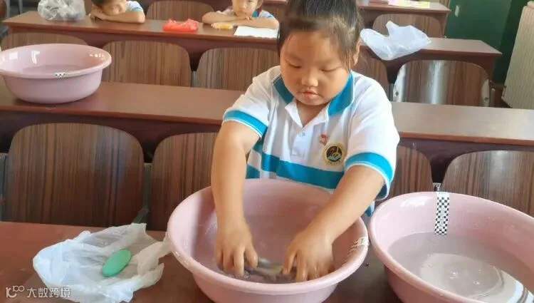 洗手绢虽是小事,但对于低年级学生的小手来说,也不是件容易事,两位小选手接力合作,将手绢洗的又快又干净。看,一双双灵巧的小手熟练地浸泡、打肥皂、搓洗、冲洗、叠好,整个流程娴熟流畅,洗起来有模有样。