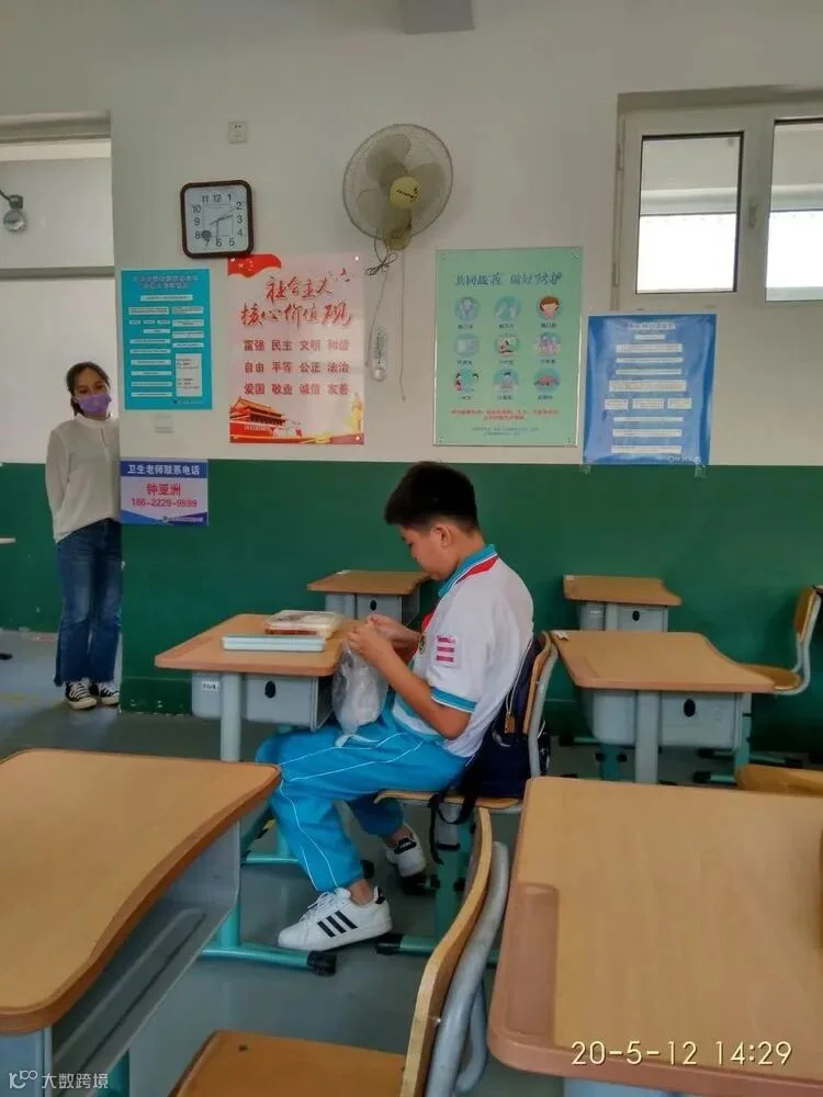 学生进入教室后,用75%浓度酒精湿巾对桌椅进行擦拭消毒后,等待上课。