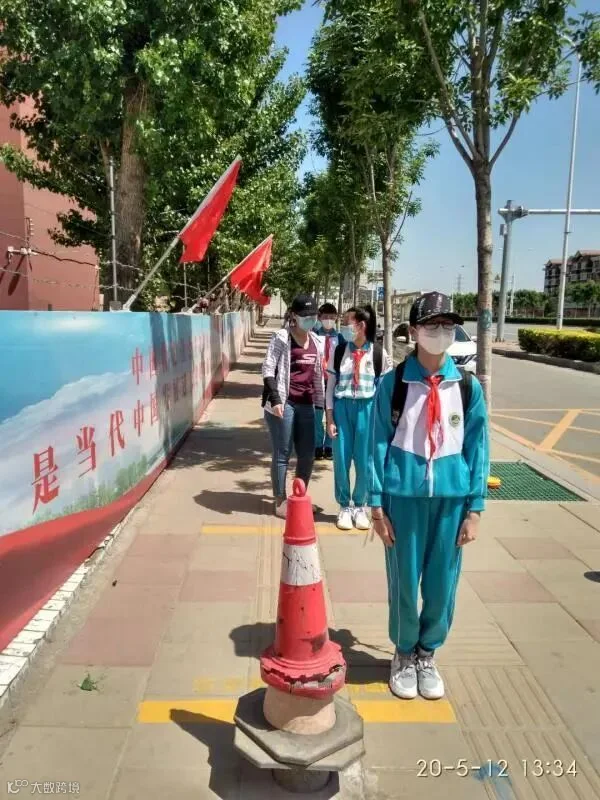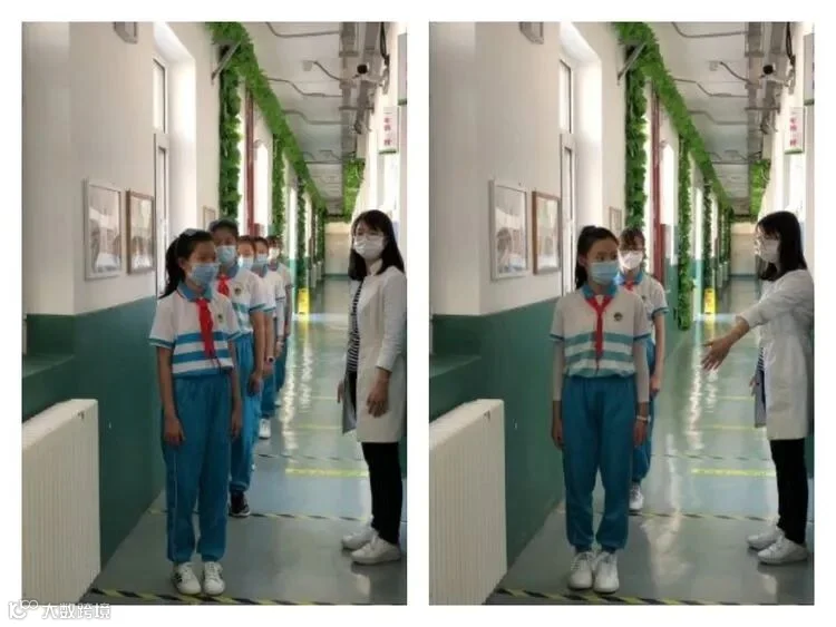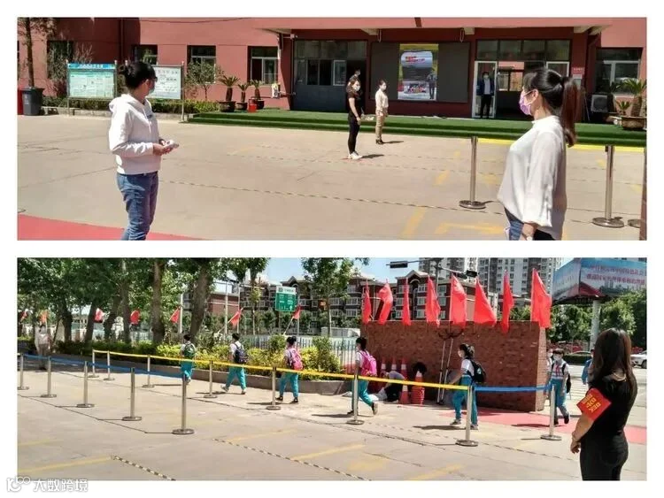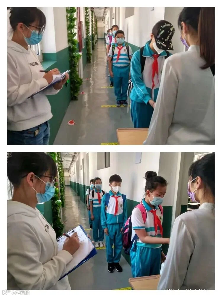 学生在校实行封闭式管理,学生家长按照学校规定时间错峰送学生。学生按秩序监督岗老师的指引进入检测通道,按一米间隔线排队、有序进校。