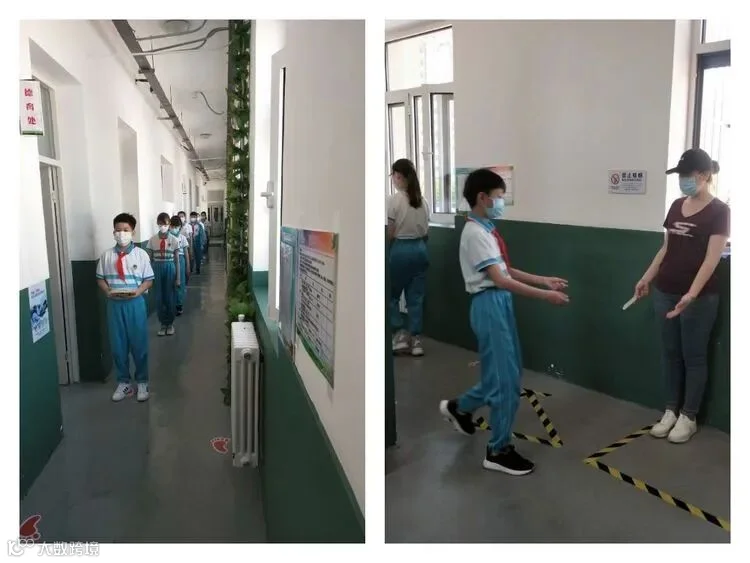 学生排队依次经过测温点,检测合格后按照指定路线进入教学楼,体温异常学生按照预案到临时隔离点进行处置。