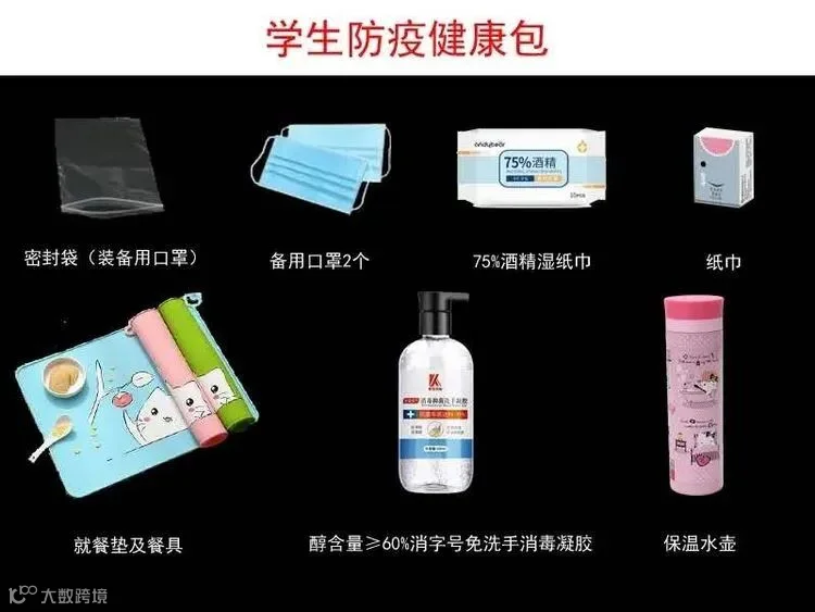 请家长为学生准备开学防疫健康包,内含口罩、免洗洗手液、75%乙醇消毒湿巾、带盖的水杯、餐具、装口罩的塑料袋或密封袋。出门前一定要测体温,正确佩戴好口罩。
