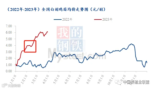 下半月,白羽鸡苗价格连冲高位,首先,因2022年12月份至2023年1月份期间,多家种禽企业出现了淘汰老周龄父母代种鸡、父母代种鸡强制换羽、种蛋转商品蛋等情况;使得父母代在产存栏出现了减量,种蛋供应量不足。且父母代换羽种鸡尚未完全恢复开产,叠加新开产种鸡量不大;由此影响至市场鸡苗供应量不大,且大多集中于中大型种禽企业;其次,养殖端前期长达2个多月的持续亏损,主产区内养殖空棚率高达60%-70%。随着新冠病毒阴霾消散,养殖端开始恢复正常补栏,种禽企业排苗计划较快;最后,毛鸡价格频频上调,养殖端盈利可观,补栏积极性得以带动。综合多方利好因素支撑,鸡苗价格顺势涨至高位。