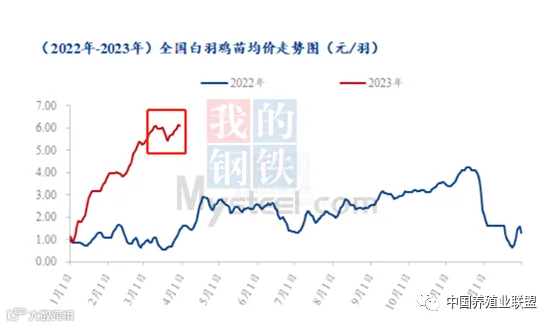2023年3月份,截至3月30日,白羽鸡苗均价5.80元/羽,较2月鸡苗均价继续上涨33.33%,环比涨幅33.33%,同比涨幅566.67%;月内白羽鸡苗价格涨至高点后高位震荡。