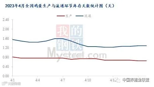根据Mysteel鸡蛋团队对全国10个地区,31个产区市场的最新调查数据显示,2023年4月17日,全国生产环节库存为0.65天,流通环节库存为1.29天。月内随着新开产数量减少,近期市场小码蛋出货压力减小,整体供应端维持稳定。加之当前蛋价处于阶段性高位,养殖单位多以顺势出货,经销商按需采购为主,两者均维持低位库存。