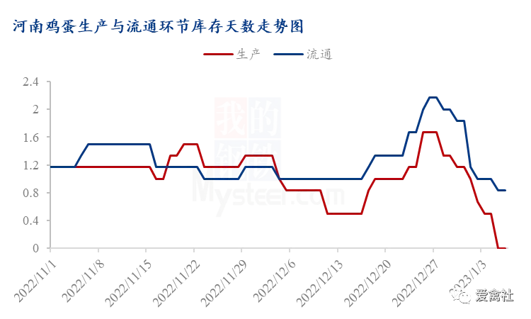 此外河南省内生产、流通环节库存天数减至低位,12月下旬随着蛋价持续走跌,省内整体库存压力加大,多数库存增至3天以上,后随着内销需求好转,货源流通加快,库存逐渐减少,截至1月6日,省内生产环节库存接近于0,流通环节库存天数在0.83天左右,且多数当地蛋商从外围市场进行调货。