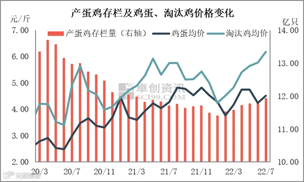 据卓创资讯监测数据显示,2022年7月全国在产蛋鸡存栏量约11.94亿只,环比增幅1.10%,同比增幅1.89%。虽然在产蛋鸡存栏量缓慢增长,仍处于近年低位,供应面对鸡蛋价格起到底部支撑的作用。
