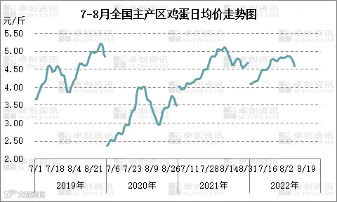 卓创资讯监测数据显示,2019-2021年的8月全国主产区鸡蛋均价环比涨幅在10%-15%。8月1-16日,全国主产区鸡蛋均价4.74元/斤,环比7月同期涨幅10.23%,较往年同期仍处相对高位。