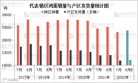 通过近几年的数据分析可知,7-8月份产区、销区鸡蛋销量多呈增长趋势,环比增幅分别为1%-3%、2%-7%。据卓创资讯监测数据显示,2022年7月主产区代表市场发货量环比增幅1.84%,主销区代表市场鸡蛋销量环比增幅4.68%,市场整体销售量增加,符合鸡蛋季节性需求旺季的规律。