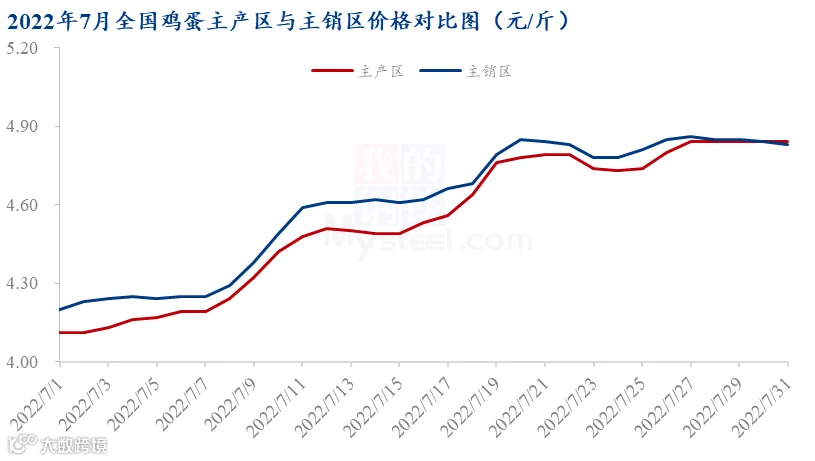 从供需层面来看价格,据Mysteel农产品数据统计:7月份全国主产区均价4.51元/斤,较上月上涨0.23元/斤,涨幅5.37%;主销区均价4.58元/斤,较上月上涨0.22元/斤,涨幅5.05%。
