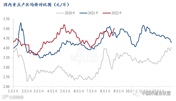 从价格表现方面来看,截至8月10日,产区均价从月初4.84元/斤跌至4.58元/斤,跌幅5.37%。然而诸多利好叠加,导致蛋价大跌过后“U”型反弹,从14-22日8天时间价格反弹至5.02元/斤,涨幅4.80%。随着支撑价格大涨的利好因素释放,目前蛋价逐步回归到正常理性的状态,业内人士对后期仍抱较大预期。