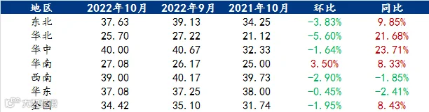 从养殖方面看,以生猪为例,据Mysteel统计,10月生猪出栏均价为26.68元/公斤,较上月上涨3.02元/公斤,环比上涨12.76%,同比上涨106.18%。10月猪价先涨后跌,整体重心强势上移,但月末有所回落。10月Mysteel统计屠宰开工率为20.77%,较上月下跌1.20个百分点,同比下降6.20个百分点。月内屠企开工呈先増后降走势,月初正值国庆假期,市场需求较好,整体开工上涨,随着节后,消费惯性回落,且多地新冠疫情复发,消费迅速回落,连续三周屠宰开工下调,导致10月整体开工不及9月。