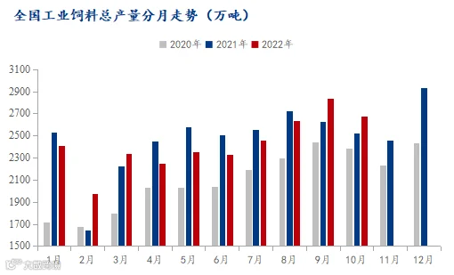 总的来说,饲料原料价格当月一路上调,饲料企业可用原料天数有所下降,同时饲料下游的生猪价格在月末则是有所回落,屠宰企业开工整体有所下降,故与之对应是10月饲料产量较上月有所下滑,但幅度有限。步入四季度,饲料原料端如豆粕因进口大豆将逐步到港,价格重心有所下调,与此同时冬季腌腊灌肠等活动逐步启动,下游对猪肉需求增加,预计11-12月全国饲料产量或将继续转好。