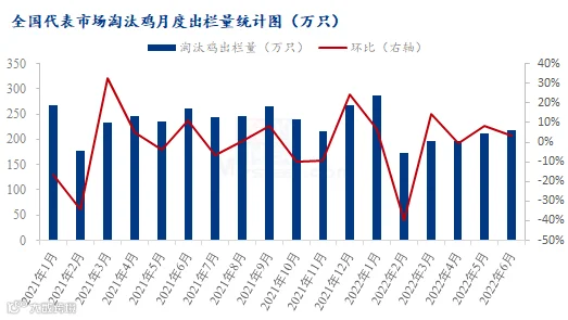 从淘汰鸡出栏情况来看,6月份Mysteel农产品对全国11个重点产区19个代表市场的淘汰鸡出栏量进行监测统计,总出栏量218.87万只,环比涨幅3.07%。6月份全国淘汰鸡出栏量先减后增,上半月受蛋价下滑影响,加之南方中元节临近,因此养殖户淘鸡意愿减弱,届时养殖端多计划集中淘汰;临近月底,蛋价跌至阶段性低位,而淘汰鸡价格偏高,多顺势出栏适龄老鸡。综合来看,6月份受蛋价及淘鸡价格影响较大,淘鸡出栏量呈小幅增加走势。
