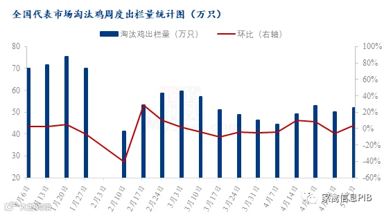 对全国 11 个重点产区 19 个代表市场的淘汰鸡出栏量进行监测统计,上周总出栏量 52.30 万只,环比增幅 5.34%。近期随着蛋价走低、天气升温、道路运输恢复,全国主产区老鸡淘汰量有所增加,淘汰鸡市场交易升温,但依据在产蛋鸡日龄推算,目前可淘鸡数量有限,故淘汰鸡整体出栏与之前相比依旧处于低位。
