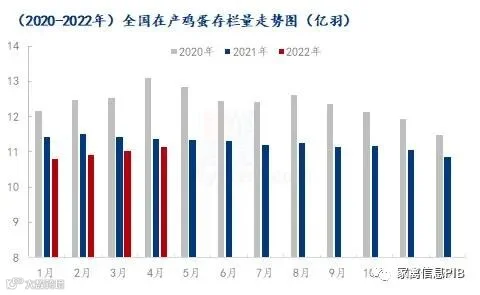 据数据统计显示,4月份全国在产蛋鸡存栏量约为 11.15 亿只,环比增幅 1.18%,同比跌幅 2.00%。进入5月份,新开产蛋鸡主要为 2021 年 12月份和 今年1月份补栏的鸡苗。12月份随着终端需求减弱,蛋价下滑,养殖单位补栏谨慎,而今年1月份天气较冷,育雏成本增加,且蛋价同样不堪理想,新开产蛋鸡整体来看数量有限,但在5月份前,部分产区养殖户选择换羽,目前已经全部开产;综合开产及换羽情况来看,在产蛋鸡存栏量继续趋于小幅增加的态势。