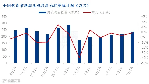 从替代品方面来看,肉鸡7月均价涨幅达16%左右。淘汰蛋鸡与肉鸡在农贸市场存在一定消费群体,为淘鸡上涨再次提供有利条件。