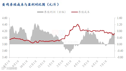 从养殖盈利情况来看,7月蛋鸡养殖成本为4.13元/斤,跌幅1.67%;养殖盈利为0.38元/斤,涨幅375%。受玉米与豆粕价格同时下跌影响,7月蛋鸡养殖成本环比有所下降。而鸡蛋市场临近需求旺季,食品企业备货量小幅提升,蛋价震荡上行,养殖盈利大幅提高,再次支撑养殖户挺价信心。
