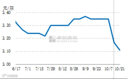 前期经销商对10月行情持谨慎态度,主要以维持低库存为主。随着鸡蛋价格上涨,在“买涨不买跌”心态下,叠加菜、肉价格上行带动市场对鸡蛋的需求,经销商积极入市采购。随着蛋价涨幅扩大,终端接货或走慢,预计短线价格有小落的可能,幅度或在0.10—0.20元/斤之间。但天气转凉提升食品消费需求及“双十一”电商刺激或将带动需求回补。