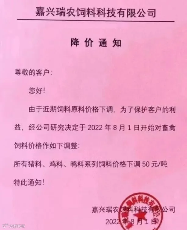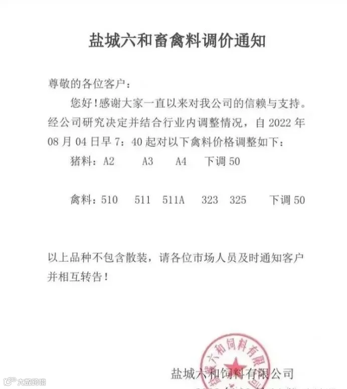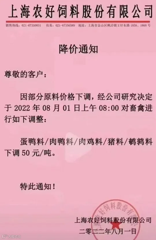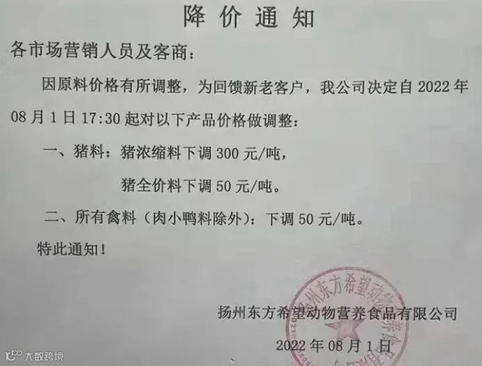 因原料价格调整,部分公司表示,为了回馈老客户对部分饲料价格下调价格,最高下调为300元/吨。其中饲料企业包括扬州东方希望、盐城六和、南通安佑等。