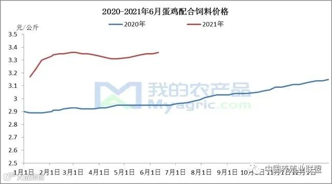 上图可见,今年的饲料价格远高于2020年,截止到6月16日,2021年蛋鸡配合饲料价为3.33元/公斤,2020年同期蛋鸡配合饲料均价为2.93元/斤,同比涨幅13.65%。根据目前一斤鸡蛋的生产成本来核算,截止到昨天一斤鸡蛋的养殖成本约4.02元。