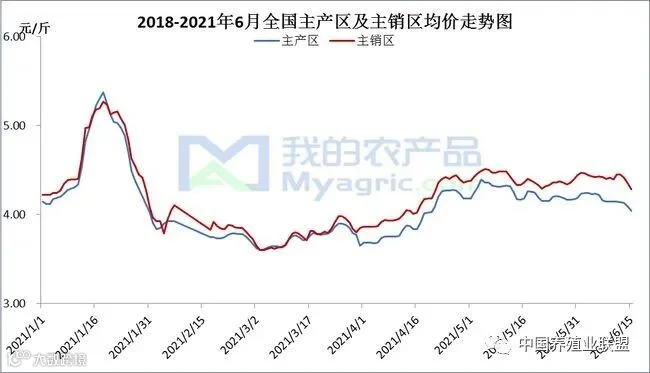 截止到6月15日,主产区均价4.04元/斤,主销区均价4.28元/斤,上图可见,从5月开始至今,蛋价一直保持窄幅震荡趋势,端午节后,市场继续走弱,蛋价开始呈现震荡下滑趋势,当前市场进入每年的消费淡季,同时,天气炎热导致鸡蛋不易存储,蛋价受多方因素影响,承压走低。