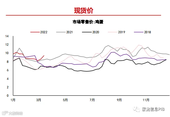 截止3月11日,现货市场蛋价偏强运行,主产区鸡蛋均价为4.30元/斤,较上周环比上涨7.50%,主销区鸡蛋价格4.54元/斤,较上周环比上涨12.94%。全国均价鸡蛋市场平均零售价4.7元/斤,环比上涨0.6元/斤,主产区淘汰鸡均价9.74元/公斤,环比变化0.64元/公斤。现货市场交投情绪升温,产区流通