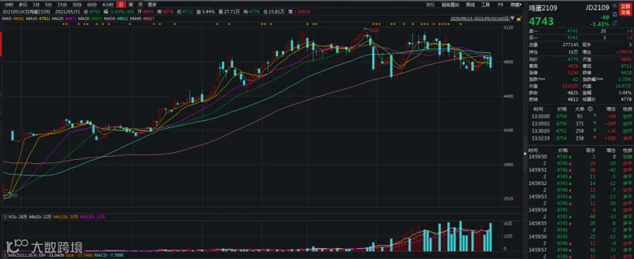 随着五一假期鸡蛋需求的阶段性消退,5月份的蛋价呈整体回调下落趋势,但由于五一之后紧接不远又有端午假期支撑叠加在产存栏相对低位,主力合约多空对峙明显,价格更偏震荡运行,今日09合约报收4743,跌幅1.43%。目前距离端午假期已不足两周,鸡蛋现货走货好转价格略有抬头,盘面走势是否会因此发生变化呢?六月蛋价又将如何演绎呢?