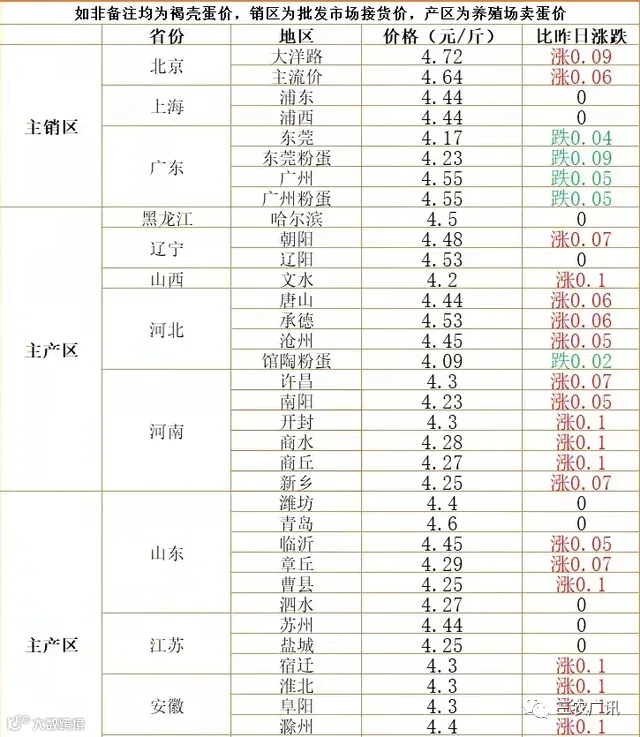 3月19日市场,虽然是大范围上涨,但是已经出现颓势。先来看看上涨的地区:北京地区上涨6-9分,主流价4.64-4.72元/斤;黑龙江、辽宁、山西、河北等北方产区的局部地区上涨5分到1毛不等,主流价4.1-4.5元/斤;河南、山东、安徽、湖北、湖南等中南部产区蛋价局在上涨5分-1毛,主流价4.2-4.45元/斤。