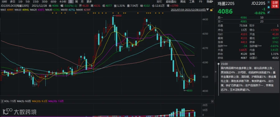 去年初开始玉米及豆粕价格震荡上行,蛋鸡养殖成本不断增加,近期玉米现货价格在2550元/吨附近,豆粕现货价格在3660元/吨,且由于南美干旱天气豆粕价格连续反弹。目前鸡蛋现货价格4.6元/斤,现货价格10月中旬开始缓慢回落,斤蛋的饲料成本3.4元,加上劳动力等别的成本,斤蛋成本应该在4元附近。近期鸡蛋的持续走弱,成本附近的支撑可以重点关注。