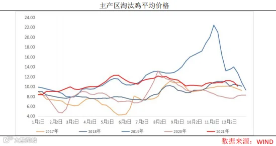 淘汰鸡本月并不多,年内也并没有出现大规模的集中淘汰,整体低于新开产蛋鸡量,此前调研了解到,基本上是淘汰和补栏同时进行,目前淘汰鸡全国均价在5元/斤附近,11月份淘汰鸡日龄为497天。12月底至1月初可重点关注,利润驱动的延淘,会不会在养殖企业在成本高企、偏低蛋鸡价格的情况下是否有集中淘汰。