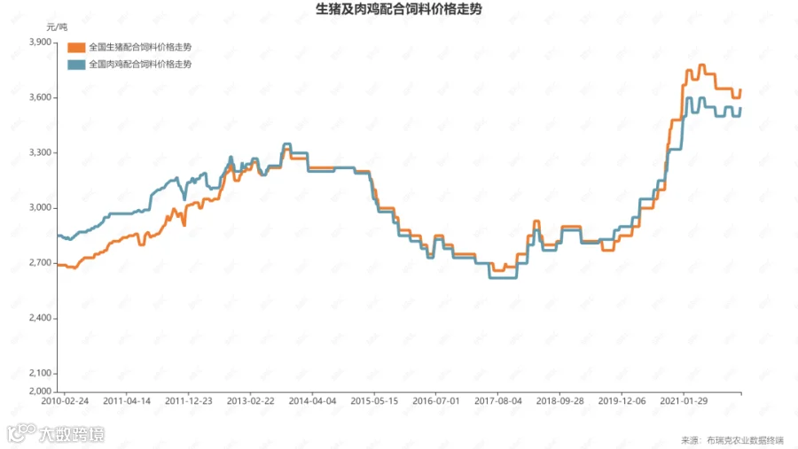 布瑞克·农产品集购网研究总监林国发对第一财经记者表示,由于饲料的两大基础原料处于高位,且小麦等玉米替代情况的减少,饲料厂无法通过自身消化原料成本上涨,只能通过成品涨价消化。