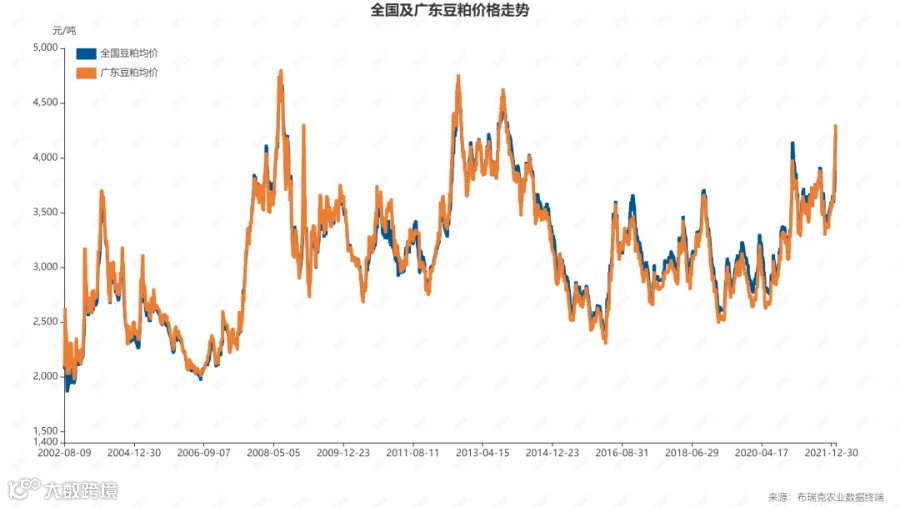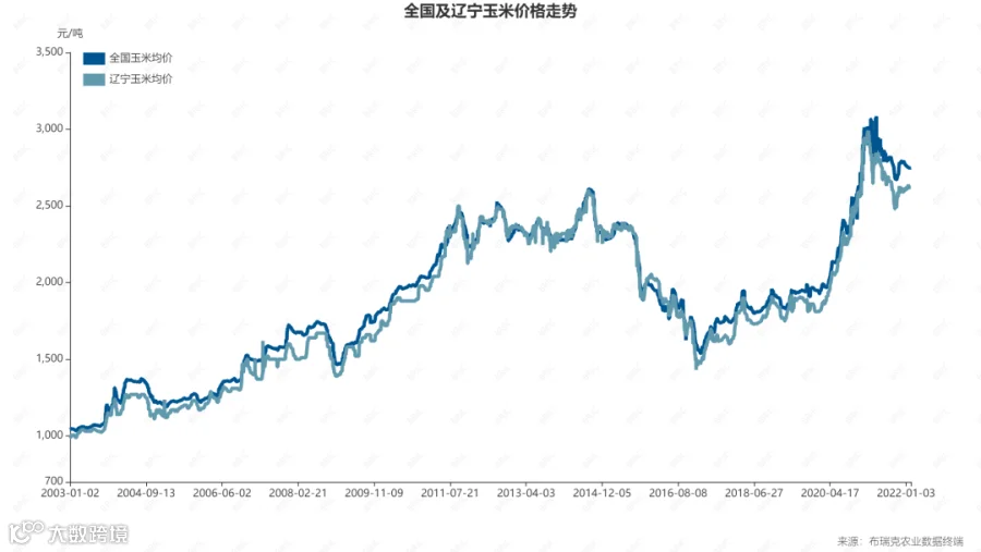 他说,相较其他农产品,玉米的价格比较稳定,2010年~2015年维持在2000~2300元/吨的区间内;直至2015年,受进口、产量等供给端因素的影响,价格下探至1300元/吨后,呈逐年递增态势。豆粕也是类似的逻辑。