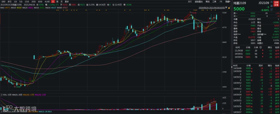 自鸡蛋主力换月以来,新的09合约冲至5000元后震荡,高度上来看五千元的价格对于疫情下的鸡蛋市场而言算得上高价,不过随着五一假期的临近,需求端的普遍看好对蛋价未来走势存在明显支撑,加上近段时间现货价格的一路上涨,鸡蛋期价突破五千后继续上涨也不无可能。但09合约却在今日极速下跌后又再度拉升报收5000,跌幅0.06%,那么是何原因致使鸡蛋期价脱离现货频频震荡呢?