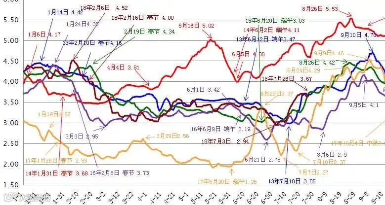 有朋友分享了一则前几年蛋价图,对比看一下,基本每年五月消费偏强,到六月开始震荡下行,每年端午一般在六月,端午之后,下行偏多。但今年六月平均蛋价,是比较高的。往年若是这个蛋价,往年饲料成本,养殖户的日子,还是比较好过,今年高昂饲料成本,吃掉了本该属于养殖场的利润。