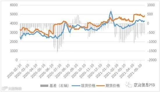 截止5月26日,鸡蛋现货平均价格为4248元/500千克,而2109合约期货收盘价为4855元/500千克,期货较现货升水较高,处于同期较高水平。由于2020年蛋鸡养殖企业普遍亏损,补栏量处于较低水平,今年市场普遍看好后市行情,看涨预期较强,盘面表现较为充分。6月中旬为传统端午节日,鸡蛋消费量预计迎来一波反弹,现货价格预期有望止跌回升,而期货较现货升水本就较高,回升幅度预计不大,待端午气氛过后,市场回归平静,现货价格回落,期价在升水较高的情况下,有回归现货的意愿,故期价会再次回落。