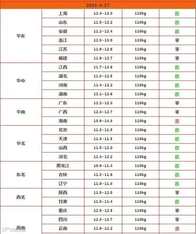 说完鸡蛋的价格,我们再说一下生猪价格,猪价系统显示最近一个月猪价呈现“跌涨跌”的走势,3月中旬到4月上旬猪价延续了之前的下跌走势,最低跌破11元,但是在最近一个星期随着养猪户的挺价惜售,以及市场生猪抛售现象的减少猪价开启上涨,不过还没涨几天,最近两天猪价再次继续到了大幅下跌的状态。其中华东区跌至11-12.8元,华中区跌至11.2-12.4元,华南区跌至12-14.6元,华北区跌至11.2-11.8元,东北区跌至10.5-11.6元,西北区为10.2-12元,西南区跌至11.6-12.6元。