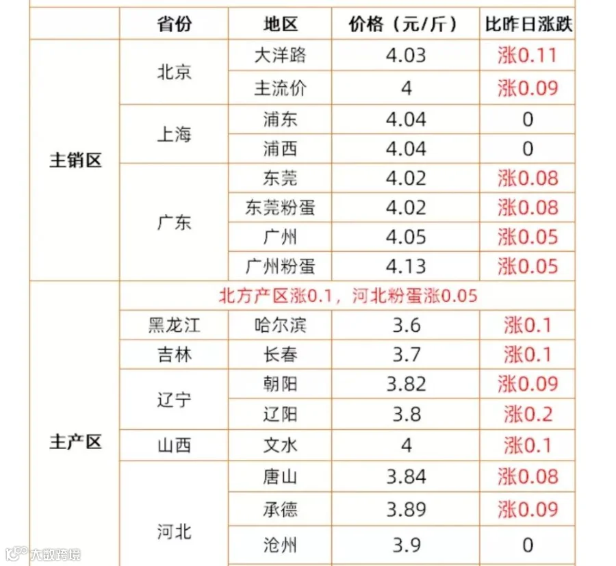最后我们看一下最新鸡蛋价格,北京上涨0.09-0.11元,上海维稳,广东上涨0.05-0.08元,东北三省中黑龙江、吉林上涨0.1元,辽宁上涨0.2元;河北上涨0.05-0.09元,河南、山东稳定,江苏上涨0.05-0.07元,安徽上涨0.07-0.08元,两湖上涨0.07-0.1元。
