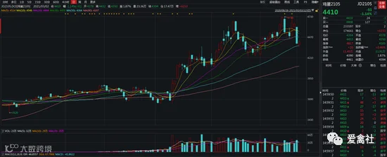 在节后的鸡蛋市场上,多空分歧较大盘面价格波动更趋剧烈,现货方面随着春节消费的过去,需求转淡现货价格出现回落无疑,重点还是在于期货方面的资金对峙,从基本面情况来看,目前期货升水过大,价格区间偏高,阶段性回落趋势明显,供应方面,虽然补栏存在下滑,但淘鸡惜售及存栏问题仍较严重,加上短期内需求刺激乏力,基本面难有支撑,蛋价更偏悲观态势,主力05合约今日报收4410,单日跌幅1.14%。