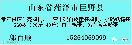 卖蛋、买蛋?找不到货源销路?【一箱蛋】全国鸡蛋供求信息平台,联合全国超过2万名蛋商/蛋鸡场/用蛋企业,超过10万养殖户,信息加入,点击关注公众号,并在对话框输入您的信息(信息包含:供应或求购的地区/品种/数量/联系人及电话等)。热线(微信):17849903345