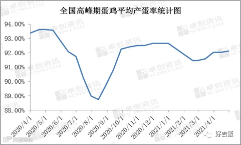 4月多数地区高峰期蛋鸡产蛋率维持稳定,部分地区小幅上下波动。当前局部产区受鸡苗质量以及前期流感疫病影响,部分蛋鸡产蛋率存在偏低现象。据数据统计,截至4月30日,全国主产区高峰期产蛋率为92.13%,环比增长0.08个百分点,同比下降1.50个百分点。