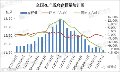 4月全国在产蛋鸡存栏量为11.830亿只,环比跌幅1.32%,同比跌幅13.65%。4月新开产的蛋鸡主要是2020年11、12月份补栏的鸡苗。