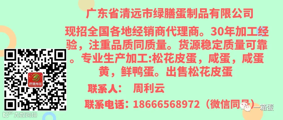 广东省清远市绿膳蛋制品有限公司现招全国各地经销商代理商。30年加工经验,注重品质同质量。货源稳定质量可靠。专业生产加工:松花皮蛋,咸蛋,咸蛋黄,鲜鸭蛋。出售松花皮蛋 周利云18666568972(微信同号)