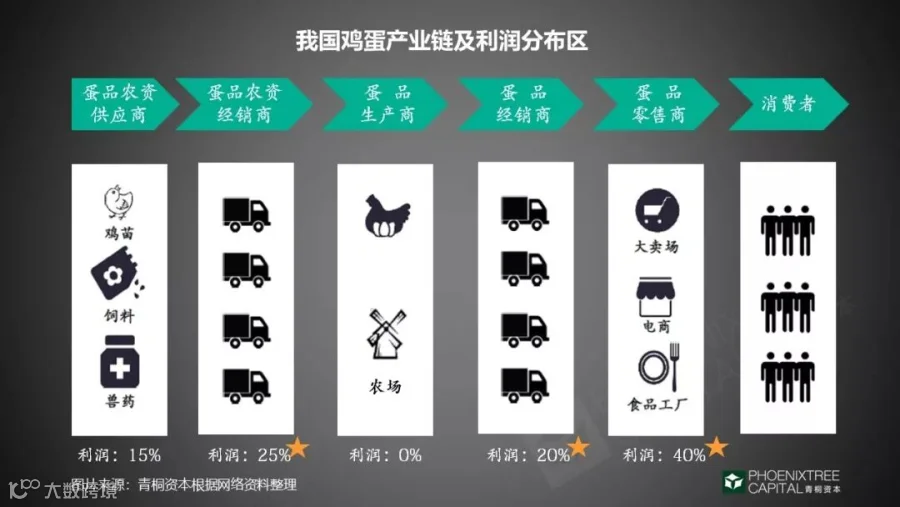 鸡蛋产业链上的利润区主要分布在流通环节,蛋品农资经销及蛋品经销的环节共享了45%的利润。