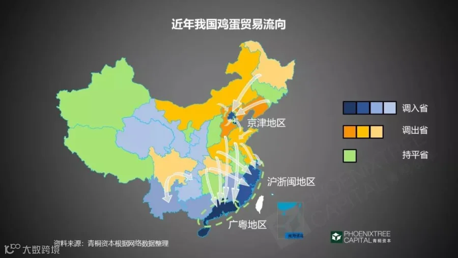 我们国家鸡蛋生产地和消费地的不完全重合也对鸡蛋的流通提出了一个难题。鸡蛋国内贸易主要是从华北、东北等生产区,流向广东、浙江、上海、北京等地,形成了鸡蛋行业的“北蛋南运”。