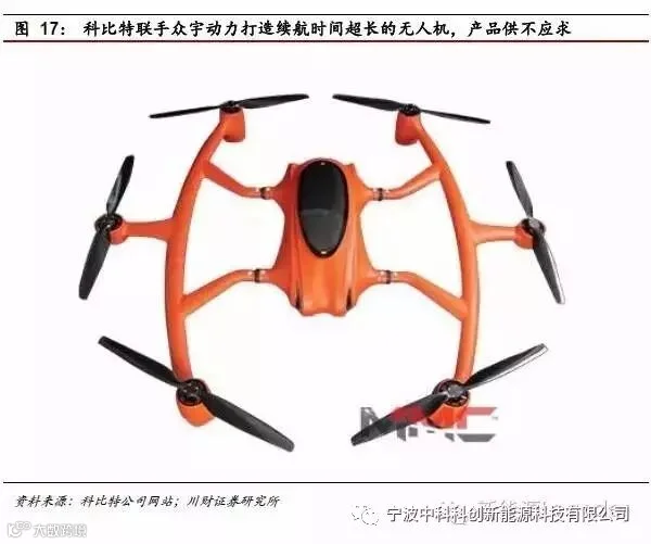 三是除了汽车领域,无人机市场的爆发拉动燃料电池需求。除了传统的军工、航天、储能领域,我们留意到已经有无人机企业用燃料电池作为能源替代锂电池,续航时间从30分钟提高至1-4个小时.目前产品刚刚推向市场,一台1KW功率的燃料电池系统加氢罐价格为20万元,远高于锂电池价格1000元,产品仍供不应求,表明市场对加长续航能力的无人机有非常大的需求。无人机市场本身非常年轻,处于爆发阶段。据市场估算,中国工业无人机的潜在市场,在现有的电力巡线、管道巡检、森林防火、公共安全上的应用规模就近1万台。