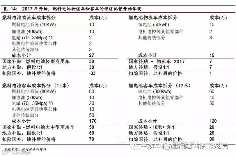 一是2017的补贴政策的调整有利于燃料电池技术。按照之前公布的2016-2020年新能源汽车补贴政策,锂电池2017-2018年和2019-2020年补助标准分别比2016年下降20%和40%,但燃料电池的补贴维持2016年水平不变。因此,基于2017补贴水平,物流车燃料电池的补贴力度较大,国家补贴就足以覆盖成本,燃料电池客车扣除补贴的成本,同样优于锂电池,对于整车厂而言吸引力明显增大。我们已经看到北汽福田、宇通客车公开宣布自己在研发燃料电池客车。