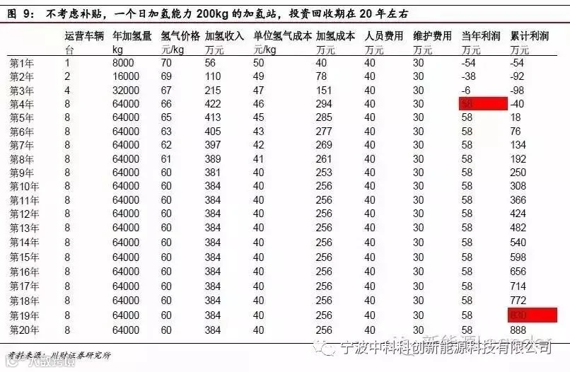 当然,加氢站面临的问题是初始投资大,500-1000万元,远远高于一个直流充电桩15万元的成本。而且,燃料电池汽车在产业化初期,肯定是从客车和一些运营车辆,如出租车、物流车开始导入,那么对应单车的加氢站投资会高达17-93万元,阻碍了商业化推广。据我们估算,不考虑国家补贴,一家加氢站盈亏平衡时间在3-4年,投资回收期在19-20年。若国家给予补贴,投资回收期可以缩短至11-12年。