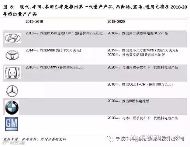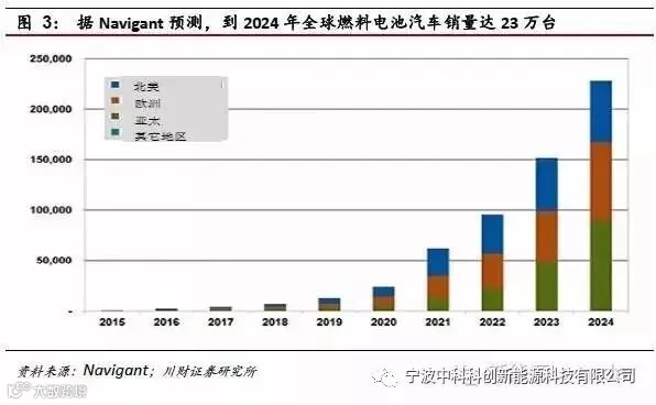 根据国家能源署的展望,美国、欧洲、日本为了实现2摄氏度的温控目标,2050年燃料电池乘用车保有量将达1亿台,占比约30%。据第三方咨询公司Navigant公司的预测,燃料电池汽车,包括乘用车和客车,2020年的新车销量在3万台左右,到2024年预计达到23万台,丰田、本田、现代已率先于2013-16年推出了量产的燃料电池车型,而通用、大众、福特、奔驰、宝马仍在研发阶段,预计将于2018-20年左右推出量产产品。因此,我们预计市场加速向上的拐点或在2020-2025年出现。