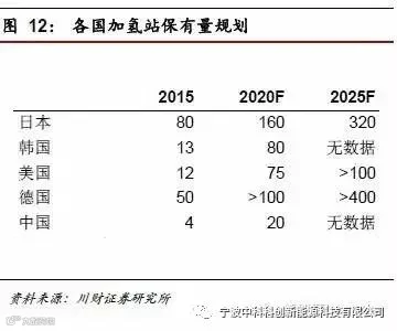 几个汽车强国日本、韩国、美国、德国都提出了野心勃勃的加氢站建设计划,到2020年,加氢站保有量目标分别为160座、80座、75座、100座,有些是政府牵头,有些是企业牵头,也证明了这些汽车强国看好燃料电池技术方向,正在积极布局基础建设。截止2015年,中国的加氢站仅4座,分别位于北京、上海、郑州、深圳。我们从行业了解到2016-17年有可能会添置4-5座加氢站,到2020年预计有400座加氢站,可以最大服务1.5万台燃料电池汽车的保有量。