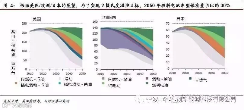 3)预计到2050年燃料电池保有量在1亿台,占比30%